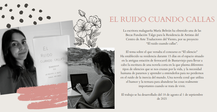 La escritora malagueña María Beltrán ha obtenido una de las Becas Fundación Talgo para la Residencia de Artistas del Centro de Arte Traductores del Viento, por su proyecto: “El ruido cuando callas”.